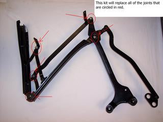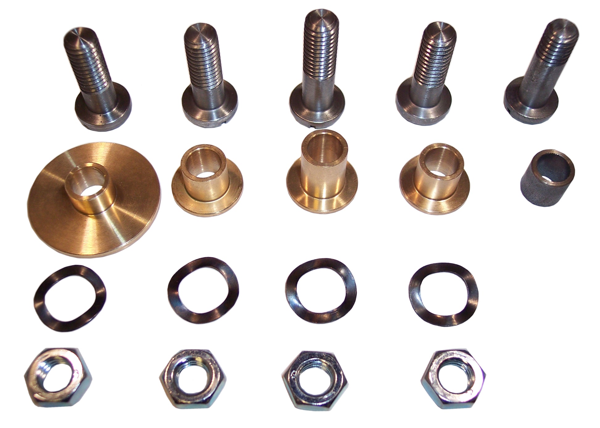 This is an 18 piece kit that is designed to replace the pivot points (see pictures) that were assembled using threaded fasteners and plastic bushings from the factory. Using CNC equipment we have machined all new bolts, bronze and super Oilite bushings (to replace the factory plastic bushings), new wave washers and thin nuts. The 1964-67 GM cars have heavy convertible top frames and after years of use the plastic bushings wear causing the side rail to become loose, they may bind or not open and close properly.