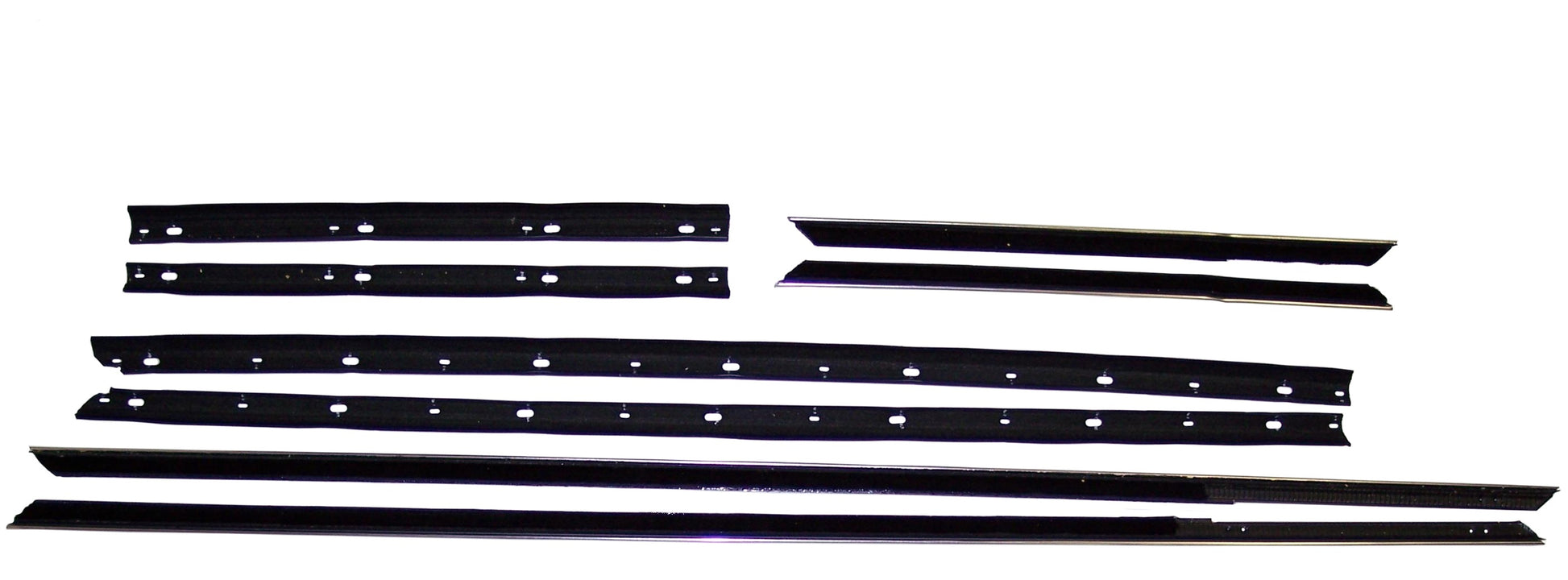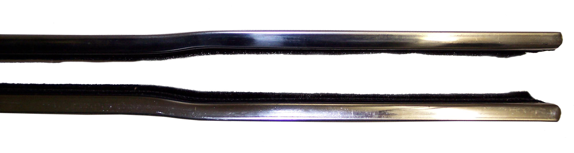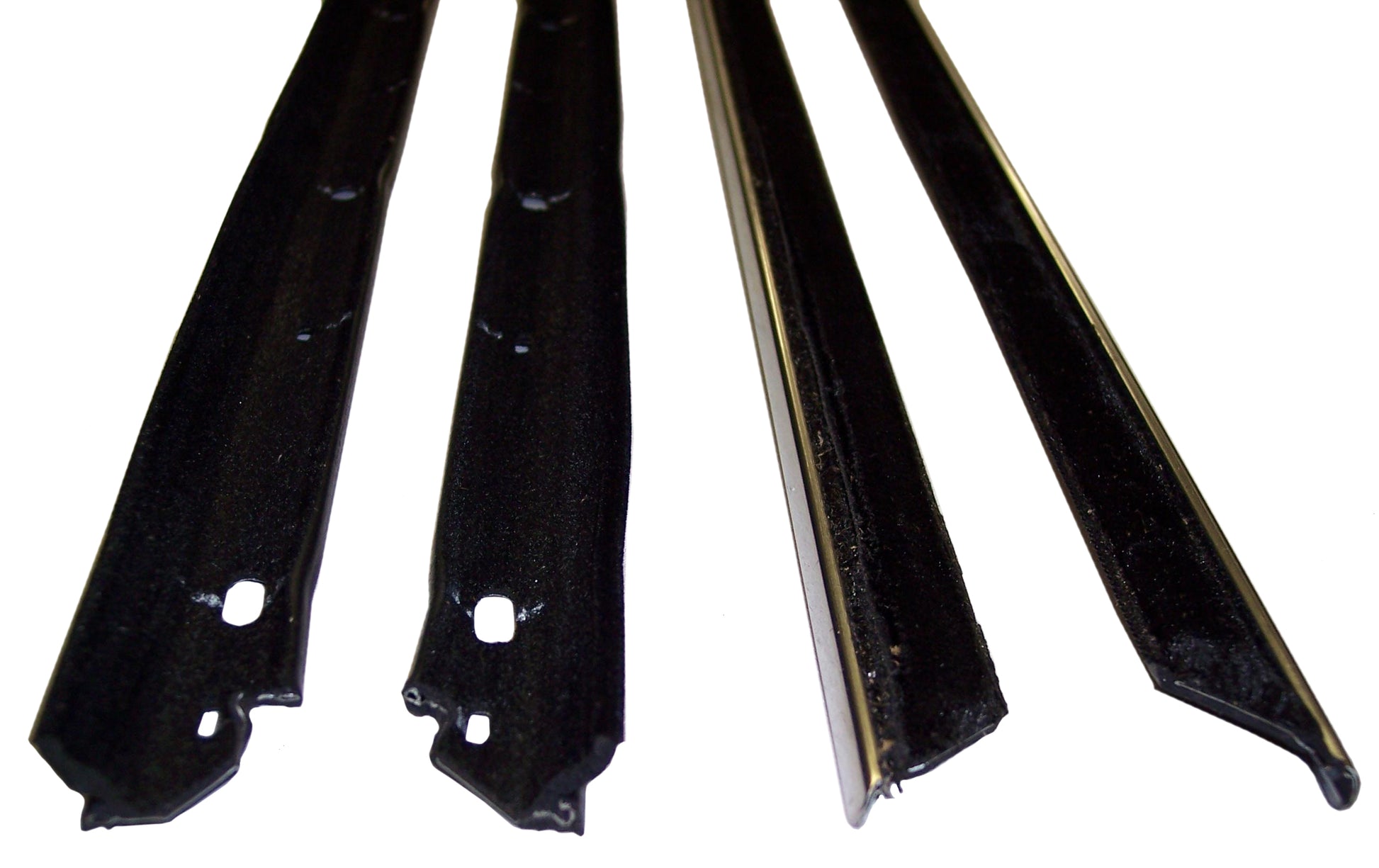 The window sweeps (also called dew wipes or felts) go horizontally across the top of the doors and quarter windows and touch the inside and outside of the glass, they keep the windows from rattling and 'wipe' the glass as it is rolled up and down. This set has no chrome.