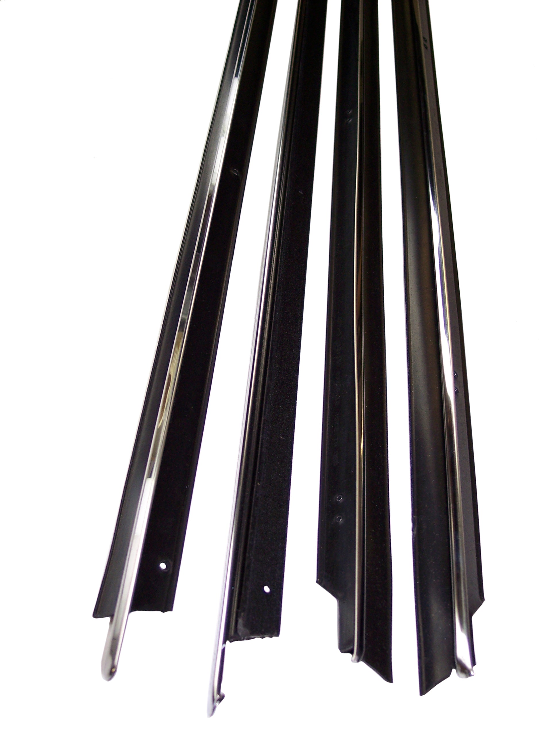 The window sweeps (also called dew wipes or felts) go horizontally across the top of the doors and touch the inside and outside of the glass, they keep the windows from rattling and 'wipe' the glass as it is rolled up and down. This set contains 4 pieces to cover both doors on the inside and outside, with chrome on outer sweep, made just for your 1971-1973 Pontiac Bonneville, Parisienne, Catalina, Granville, & Laurentian 2-door Convertible.